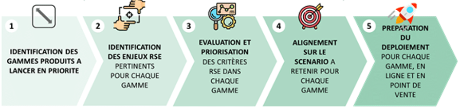 Étude RSE inspirée des méthodologies ACV, menée en partenariat avec un expert RSE : cette étape consiste à étudier l’ensemble du cycle de vie des produits pour identifier, à la maille d’une gamme de produits, les phases présentant les enjeux environnementaux, socio-économiques ou de santé et sécurité les plus critiques. La sollicitation de l’expert RSE permet d’apporter des éléments de preuve tangibles, ainsi qu’un parti-pris éclairé sur la dimension RSE particulièrement complexe.